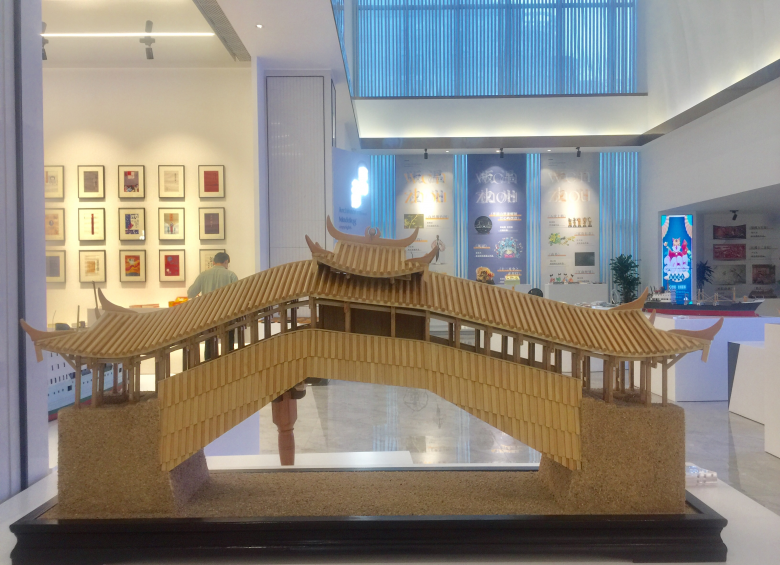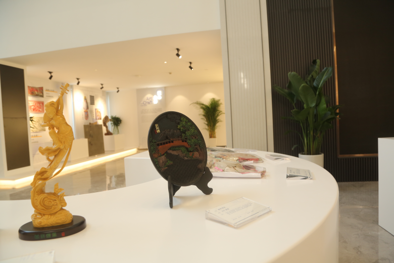 走进装饰一新的一楼门厅,一幅壁画瓯塑《瓯山越水》格外引人注目,它由浙江省工艺美术大师徐志通创作,把百里风光中给人最佳感受的瓯江、江心孤屿、雁荡山等景点加以熔炼组合,构成一幅基调阔远、极富意蕴的画卷,表现了温州特有的“诗般山水”风貌。一楼还有主展厅和尾厅,其中主展厅包括版权之路、文著之章、建构之形、视听之乐、设计之光、数据之智、匠心之作7个展示区,展示了林剑丹书法、戴宏海国画、瑞安国旗馆模型、打火机制品、《温州家人》系列作品、《温州话辞典》、书籍《芈月传》、“红点奖”产品设计作品《玛瑙系列》、《瓯居海中》雕塑模型、彩石镶嵌等80余件版权作品精品,主要围绕文字作品、口述作品、艺术作品、摄影作品、视听作品、工程设计图等9大种类版权作品,结合图片、文字、影像、音频、多媒体技术等,深入挖掘温州版权资源,集中展示具有温州辨识度的代表性版权作品,充分展现我市版权保护运用的典型事例和良好成效,讲好温州版权故事。