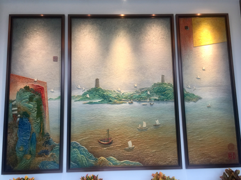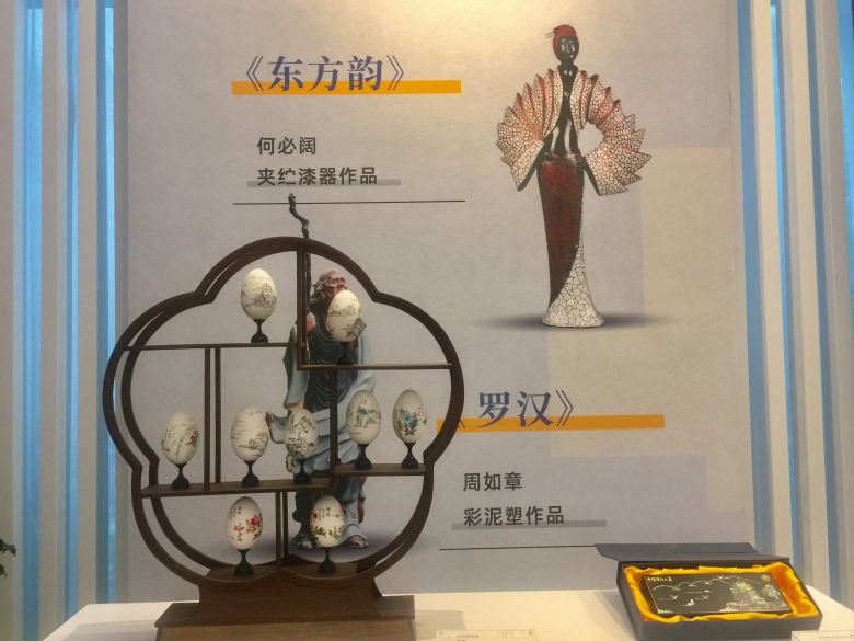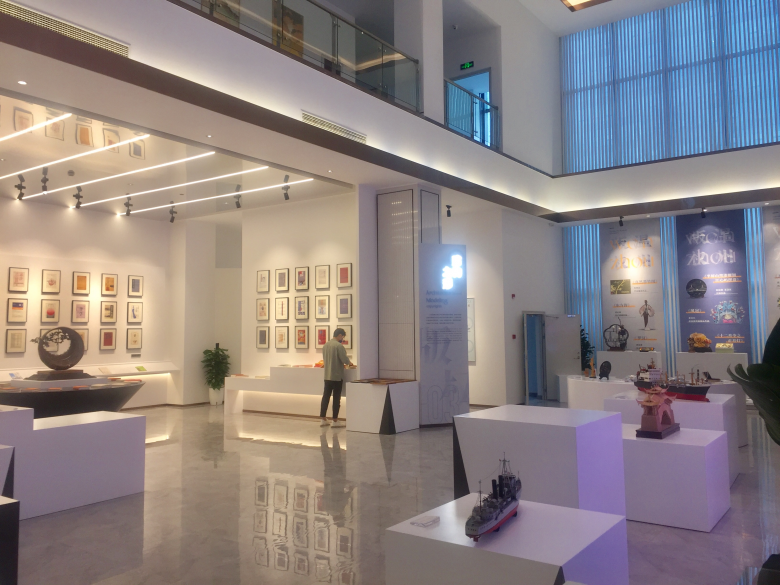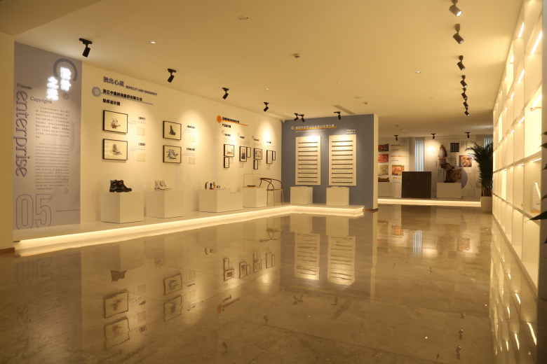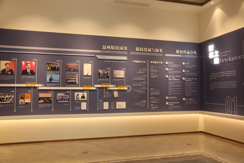 走进装饰一新的一楼门厅,一幅壁画瓯塑《瓯山越水》格外引人注目,它由浙江省工艺美术大师徐志通创作,把百里风光中给人最佳感受的瓯江、江心孤屿、雁荡山等景点加以熔炼组合,构成一幅基调阔远、极富意蕴的画卷,表现了温州特有的“诗般山水”风貌。一楼还有主展厅和尾厅,其中主展厅包括版权之路、文著之章、建构之形、视听之乐、设计之光、数据之智、匠心之作7个展示区,展示了林剑丹书法、戴宏海国画、瑞安国旗馆模型、打火机制品、《温州家人》系列作品、《温州话辞典》、书籍《芈月传》、“红点奖”产品设计作品《玛瑙系列》、《瓯居海中》雕塑模型、彩石镶嵌等80余件版权作品精品,主要围绕文字作品、口述作品、艺术作品、摄影作品、视听作品、工程设计图等9大种类版权作品,结合图片、文字、影像、音频、多媒体技术等,深入挖掘温州版权资源,集中展示具有温州辨识度的代表性版权作品,充分展现我市版权保护运用的典型事例和良好成效,讲好温州版权故事。