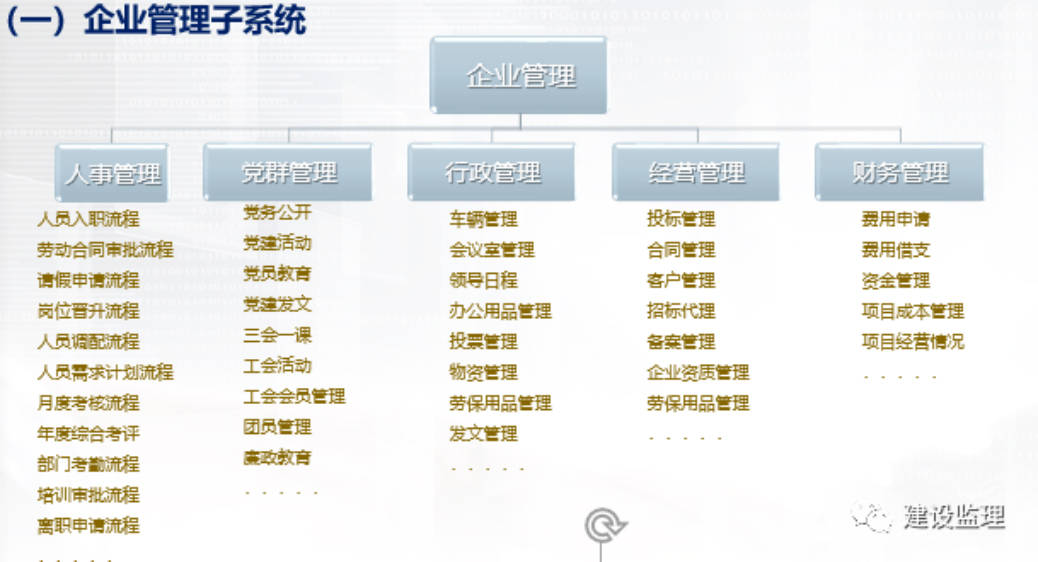 对于监理企业而言,信息化建设或者说数据应用主要分为两大模块, 即基于各生产业务及相应管理的生产管理模块和包含企业经营、财务、人力资源、科研、技术管理等诸多涉及企业经营管理的企业管理模块(见图1、图2)。