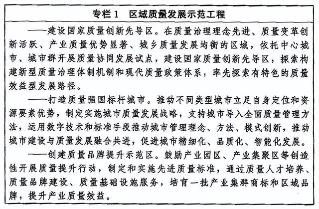 (九)打造区域质量发展新优势。加强质量政策引导,推动区域质量发展与生产力布局、区位优势、环境承载能力及社会发展需求对接融合。推动东部地区发挥质量变革创新的引领带动作用,增强质量竞争新优势,实现整体质量提升。引导中西部地区因地制宜发展特色产业,促进区域内支柱产业质量升级,培育形成质量发展比较优势。推动东北地区优化质量发展环境,加快新旧动能转换,促进产业改造升级和质量振兴。健全区域质量合作互助机制,推动区域质量协同发展。深化质量强省建设,推动质量强市、质量强业向纵深发展,打造质量强国建设标杆。