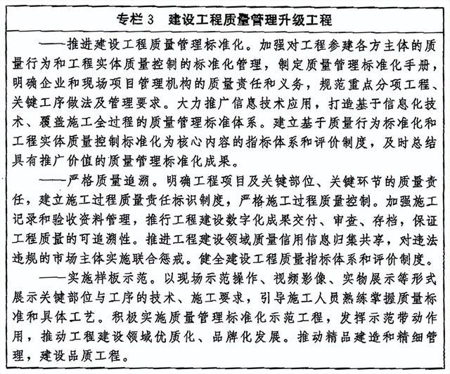 (十五)打造中国建造升级版。坚持百年大计、质量第一,树立全生命周期建设发展理念,构建现代工程建设质量管理体系,打造中国建造品牌。完善勘察、设计、监理、造价等工程咨询服务技术标准,鼓励发展全过程工程咨询和专业化服务。完善工程设计方案审查论证机制,突出地域特征、民族特点、时代风貌,提供质量优良、安全耐久、环境协调、社会认可的工程设计产品。加大先进建造技术前瞻性研究力度和研发投入,加快建筑信息模型等数字化技术研发和集成应用,创新开展工程建设工法研发、评审、推广。加强先进质量管理模式和方法高水平应用,打造品质工程标杆。推广先进建造设备和智能建造方式,提升建设工程的质量和安全性能。大力发展绿色建筑,深入推进可再生能源、资源建筑应用,实现工程建设全过程低碳环保、节能减排。