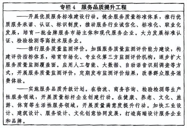 (七)提高产业质量竞争水平。推动产业质量升级,加强产业链全面质量管理,着力提升关键环节、关键领域质量管控水平。开展对标达标提升行动,以先进标准助推传统产业提质增效和新兴产业高起点发展。推进农业品种培优、品质提升、品牌打造和标准化生产,全面提升农业生产质量效益。加快传统制造业技术迭代和质量升级,强化战略性新兴产业技术、质量、管理协同创新,培育壮大质量竞争型产业,推动制造业高端化、智能化、绿色化发展,大力发展服务型制造。加快培育服务业新业态新模式,以质量创新促进服务场景再造、业务再造、管理再造,推动生产性服务业向专业化和价值链高端延伸,推动生活性服务业向高品质和多样化升级。完善服务业质量标准,加强服务业质量监测,优化服务业市场环境。加快大数据、网络、人工智能等新技术的深度应用,促进现代服务业与先进制造业、现代农业融合发展。