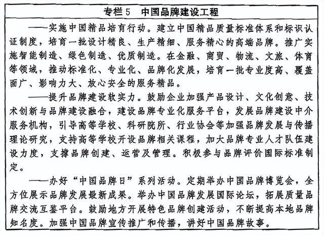 ——品牌建设取得更大进展。品牌培育、发展、壮大的促进机制和支持制度更加健全,品牌建设水平显著提高,企业争创品牌、大众信赖品牌的社会氛围更加浓厚,品质卓越、特色鲜明的品牌领军企业持续涌现,形成一大批质量过硬、优势明显的中国品牌。