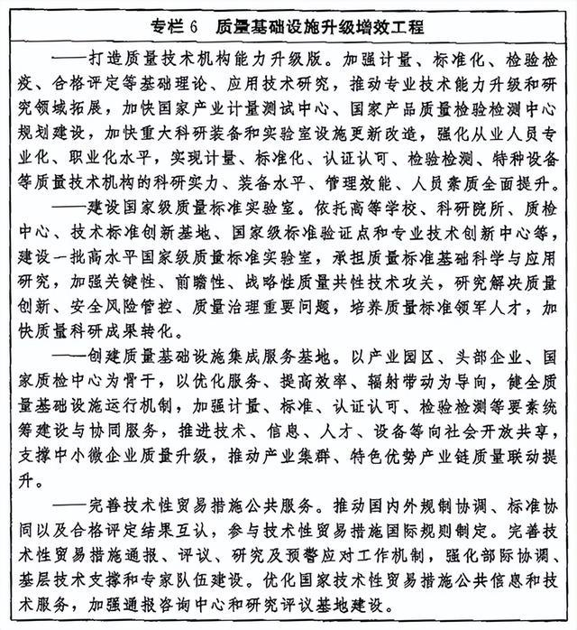 ——质量基础设施更加现代高效。质量基础设施管理体制机制更加健全、布局更加合理,计量、标准、认证认可、检验检测等实现更高水平协同发展,建成若干国家级质量标准实验室,打造一批高效实用的质量基础设施集成服务基地。