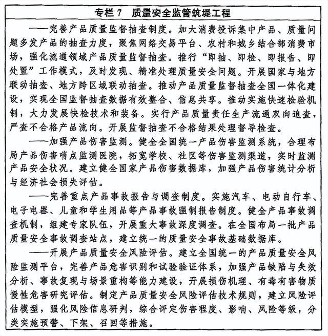 (二十七)优化质量监管效能。健全以“双随机、一公开”监管和“互联网+监管”为基本手段、以重点监管为补充、以信用监管为基础的新型监管机制。创新质量监管方式,完善市场准入制度,深化工业产品生产许可证和强制性认证制度改革,分类放宽一般工业产品和服务业准入限制,强化事前事中事后全链条监管。对涉及人民群众身体健康和生命财产安全、公共安全、生态环境安全的产品以及重点服务领域,依法实施严格监管。完善产品质量监督抽查制度,加强工业品和消费品质量监督检查,推动实现生产流通、线上线下一体化抽查,探索建立全国联动抽查机制,对重点产品实施全国企业抽查全覆盖,强化监督抽查结果处理。建立健全产品质量安全风险监控机制,完善产品伤害监测体系,开展质量安全风险识别、评估和处置。建立健全产品质量安全事故强制报告制度,开展重大质量安全事故调查与处理。健全产品召回管理体制机制,加强召回技术支撑,强化缺陷产品召回管理。构建重点产品质量安全追溯体系,完善质量安全追溯标准,加强数据开放共享,形成来源可查、去向可追、责任可究的质量安全追溯链条。加强产品防伪监督管理。建立质量安全“沙盒监管”制度,为新产品新业态发展提供容错纠错空间。加强市场秩序综合治理,营造公平竞争的市场环境,促进质量竞争、优胜劣汰。严格进出口商品质量安全检验监管,持续完善进出口商品质量安全风险预警和快速反应监管机制。加大对城乡结合部、农村等重点区域假冒伪劣的打击力度。强化网络平台销售商品质量监管,健全跨地区跨行业监管协调联动机制,推进线上线下一体化监管。
