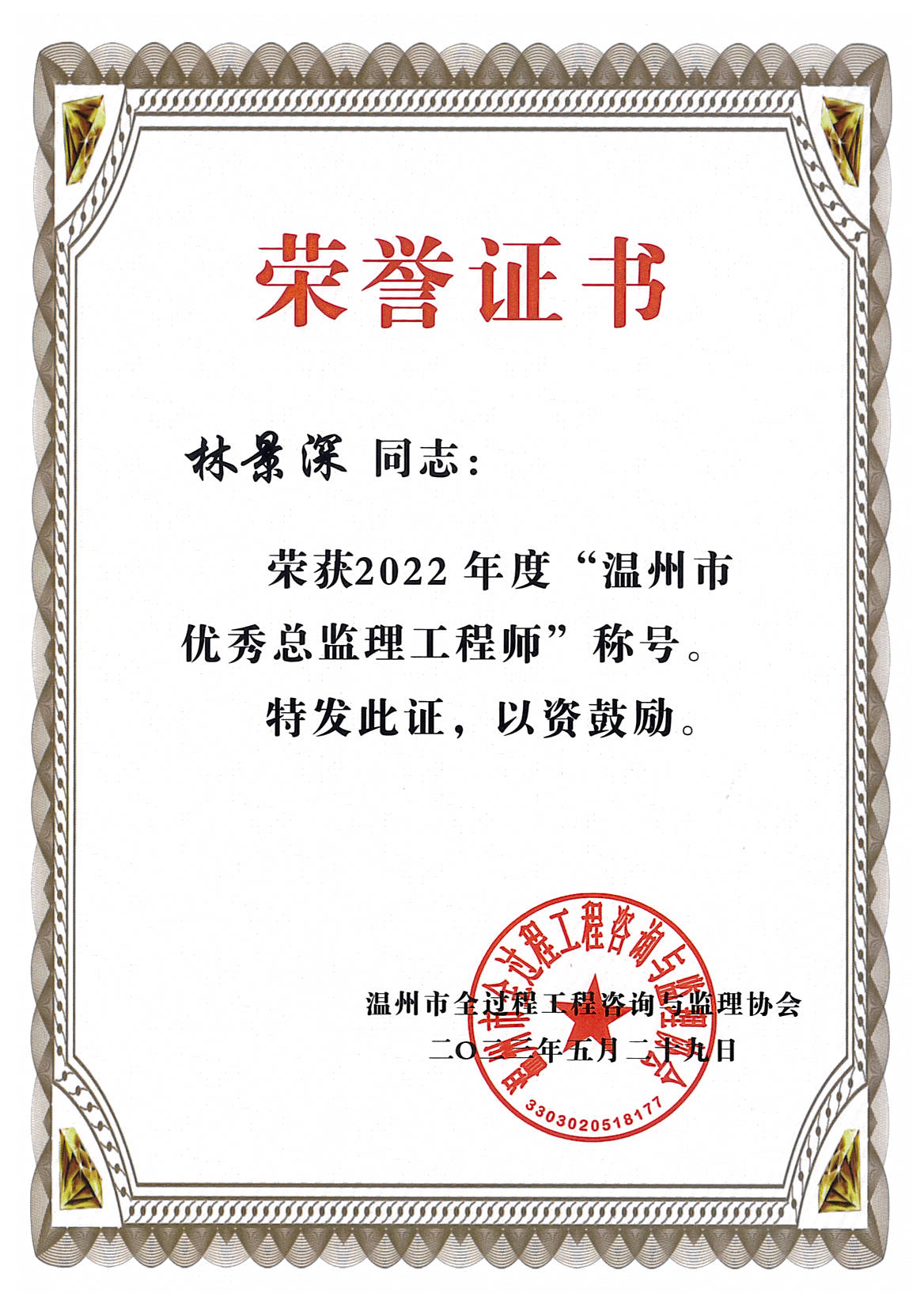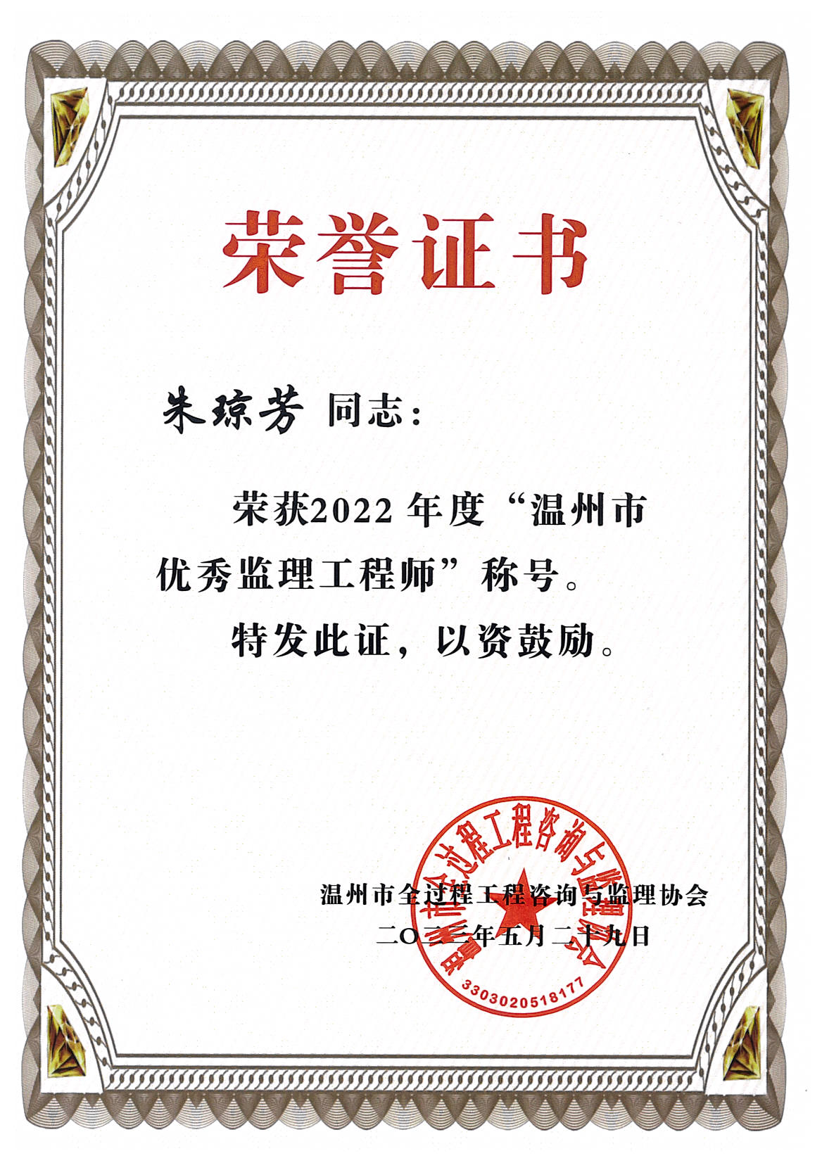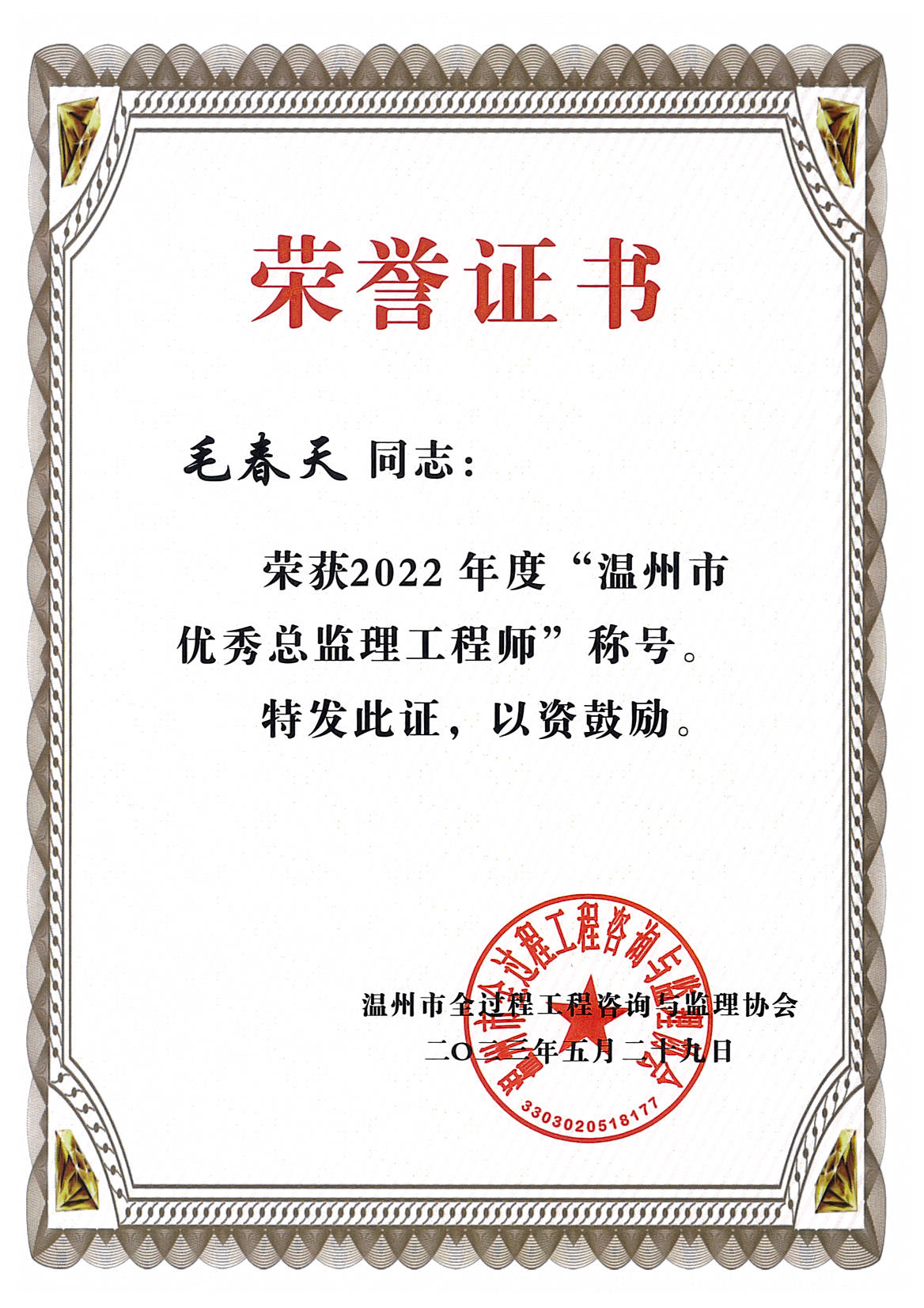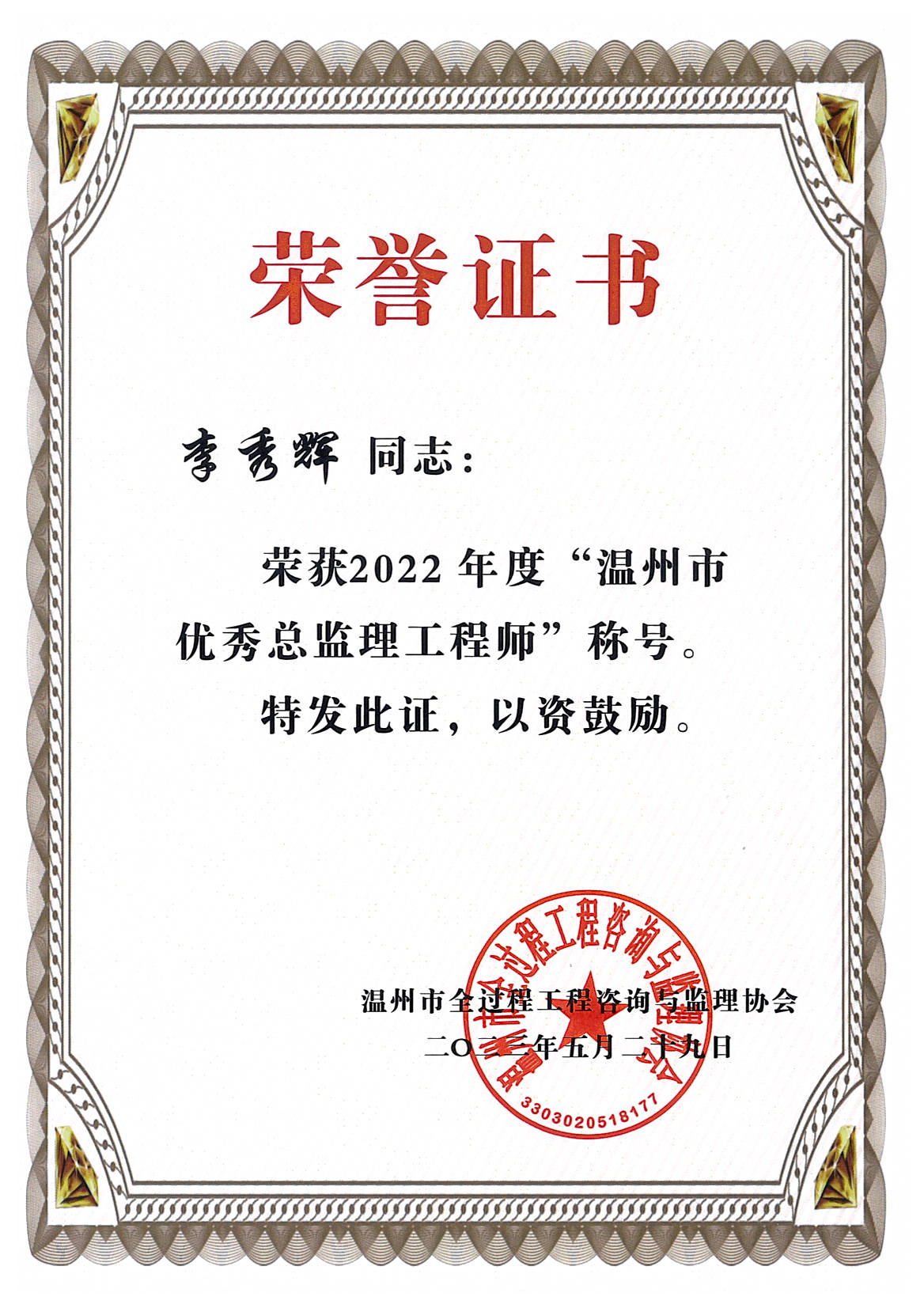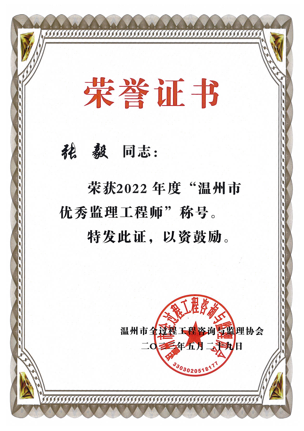 榜样力量催人奋进,先锋标杆激励前行。浙江华厦建设项目管理有限公司有这样一群伙伴,他们在追求卓越的道路上,用实际行动诠释着努力与奉献。在2022年度中李秀辉、毛春天、林景深同志获得了由温州市全过程咨询与监理协会授予的“温州市优秀总监理工程师”的称号;张毅、朱琼芳、胡金华同志获得了由温州市全过程咨询与监理协会授予的“温州市优秀监理工程师”的称号。